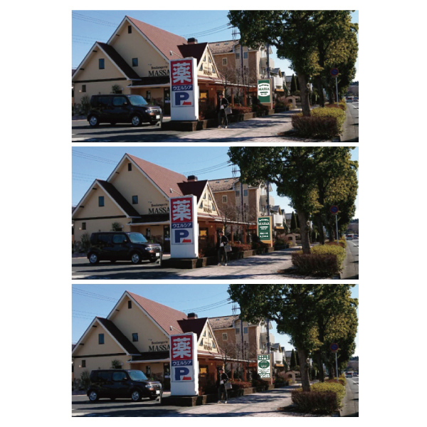 とは言え、大きさは重要で、現地に来た時顧客の視界に入る工夫が必要です。ですから、現場調査し、色やサイズや高さを考慮してデザインを組み立てていきます。近隣店舗の色かぶりに配慮も必要です。店舗周辺の木々の調査もします。四季の変化で、冬と夏では、まったく違う環境になったりします。